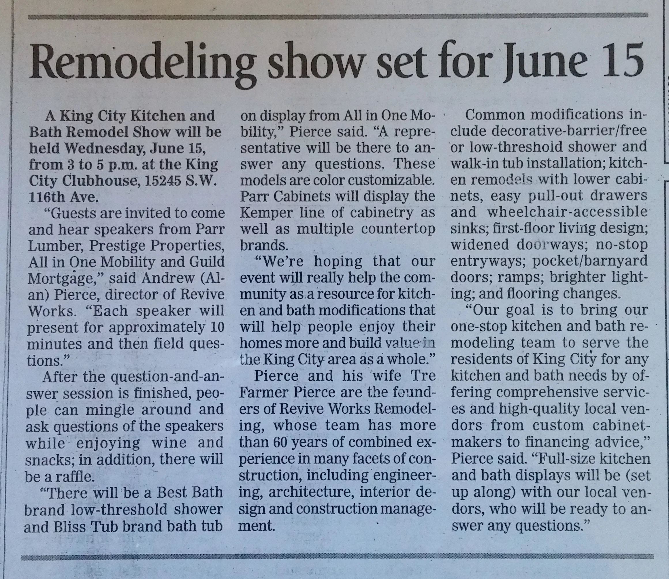 Revive Works Remodeling is excited and thankful to be selected as the subject of a special interest piece in the Regal Courier. It highlights our King City Kitchen and Bath show and it'sunique concept of providing a one stop shop for clients. The show will feature speakers and display booths from our partners and sponsors including, Parr Design Center, All in One Mobility, Interstate Flooring, Prestige Properties, Guild Mortgage, Fidelity National Title and BMW. In an effort to make the remodeling process easier, quicker and more efficient, the Revive Works telephone number provides access to all of our partners offering services from custom cabinet making, to project financing and property sales.